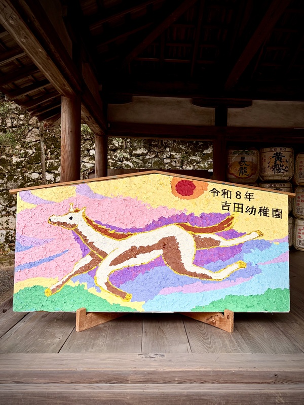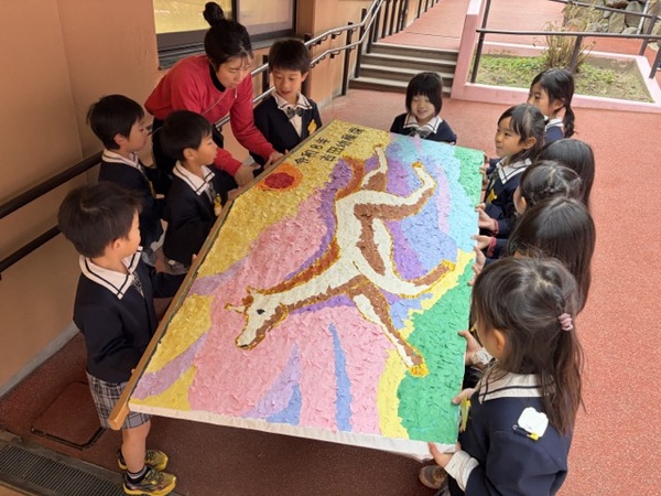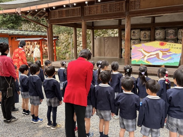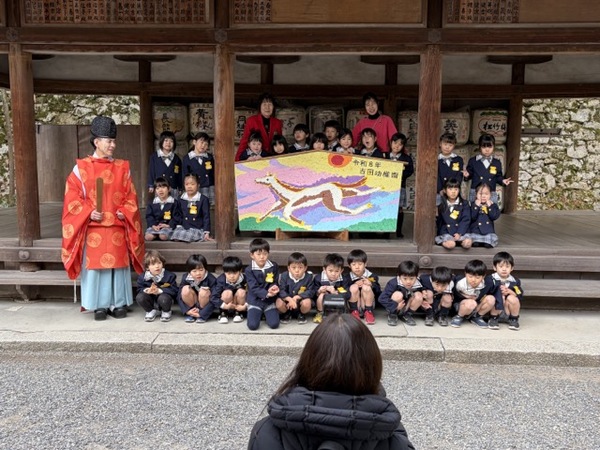 きく組の子どもたちが貼り絵で作った大絵馬を奉納しました。