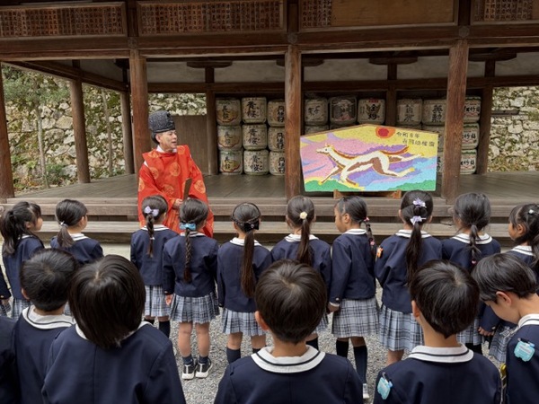 直来殿までみんなで運んだ後、神職さんから絵馬の由来のお話を聞いてご祈祷を受けました。