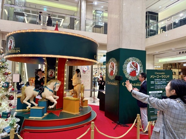 普段入ることのないデパートのバックヤードに少し緊張気味でしたが、収録は一度読み合わせのリハーサルをした後は、なんと一発録りで成功しました。高島屋の担当の方々に拍手をいただき、ご褒美に1F特設会場のメリーゴーランドに乗らせていただきました。